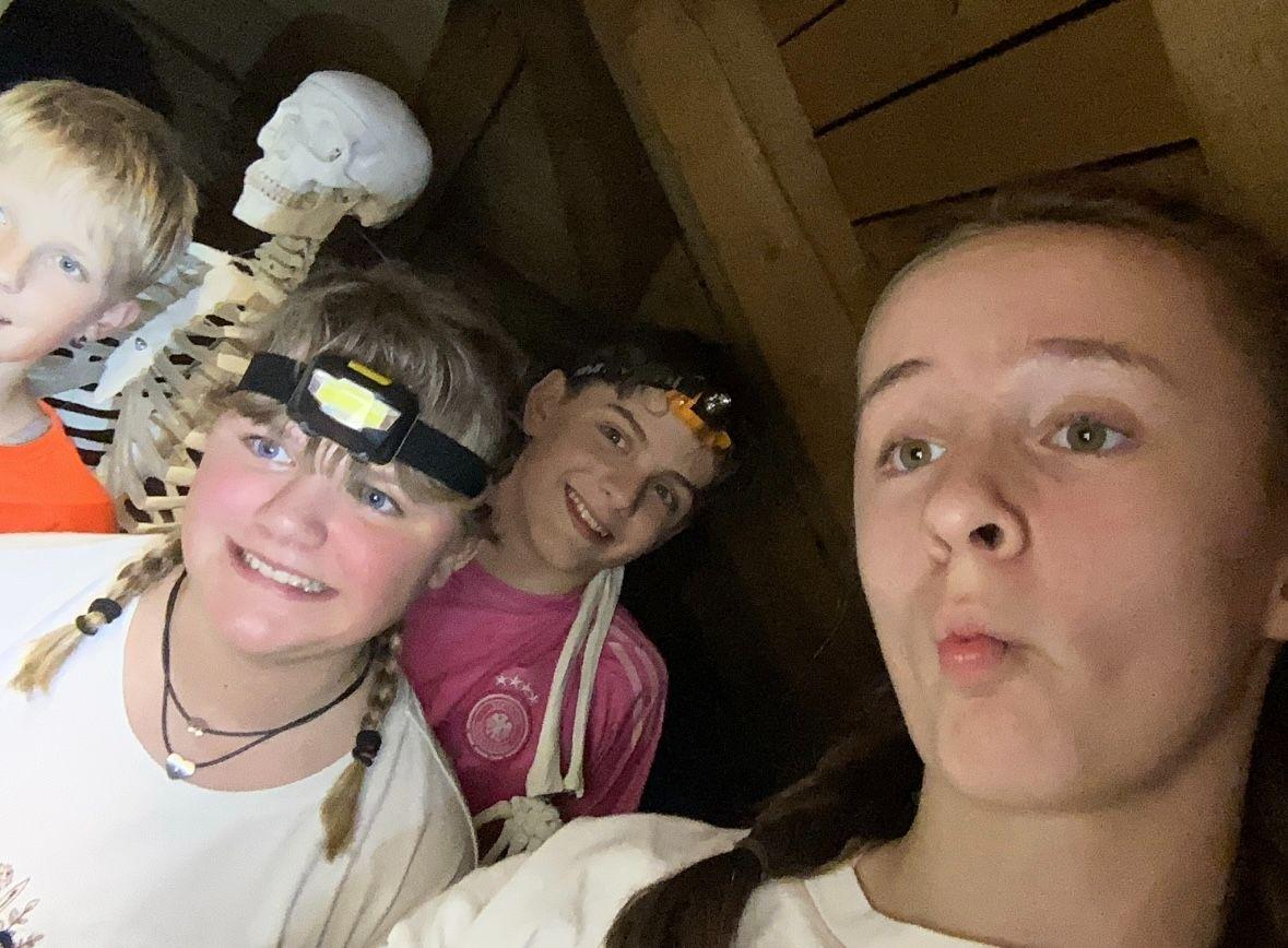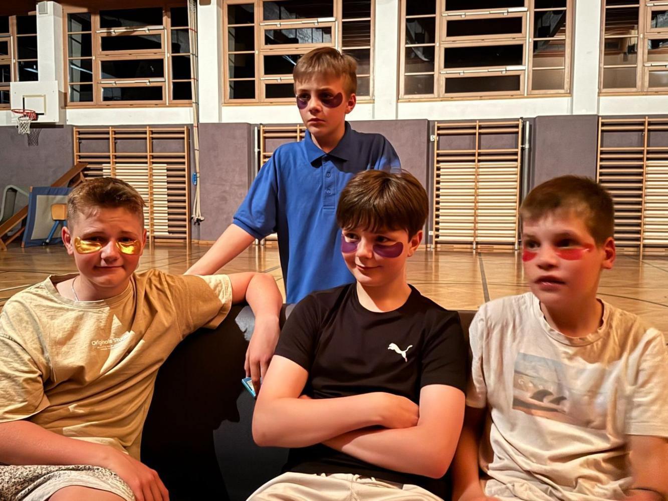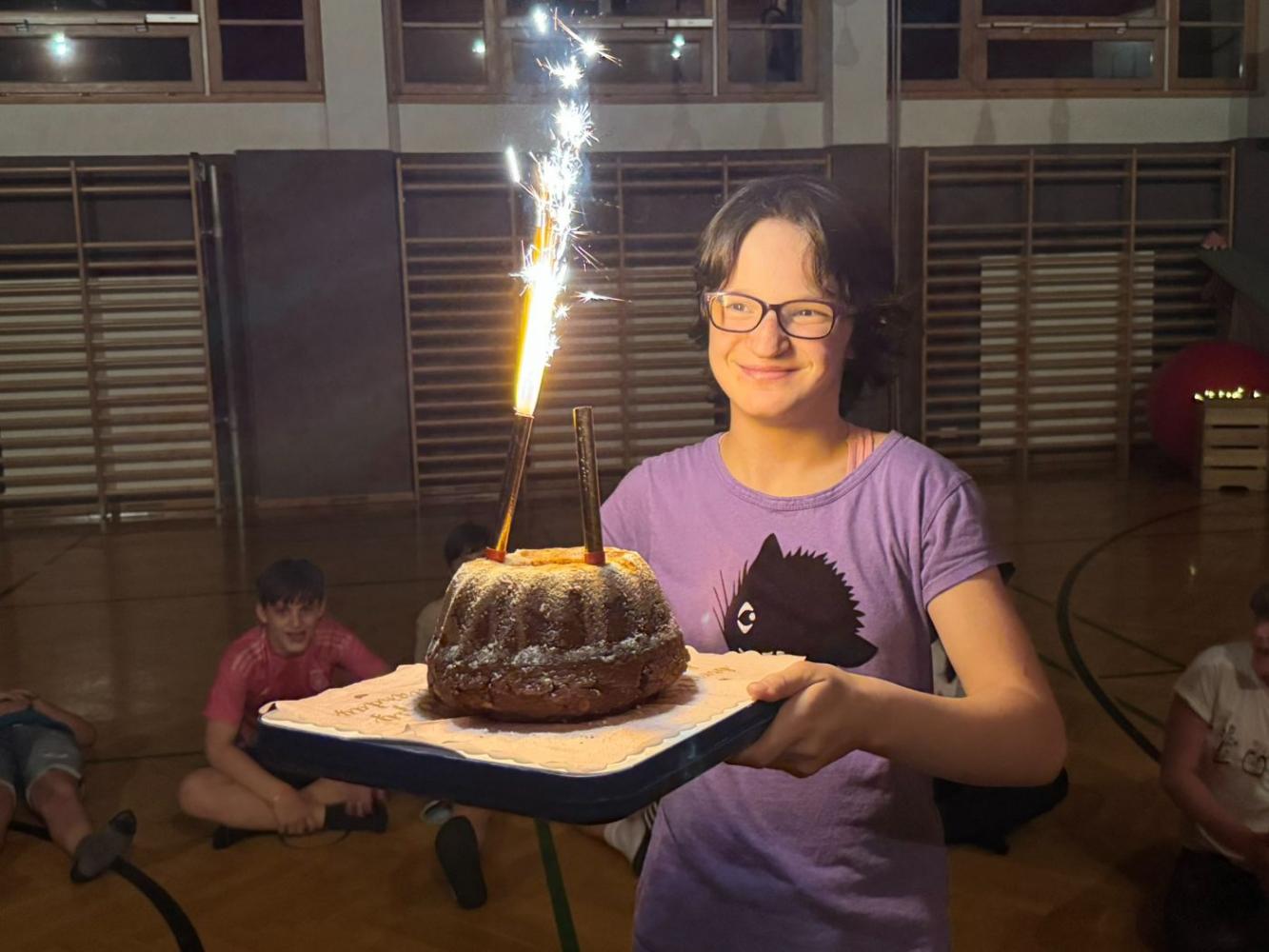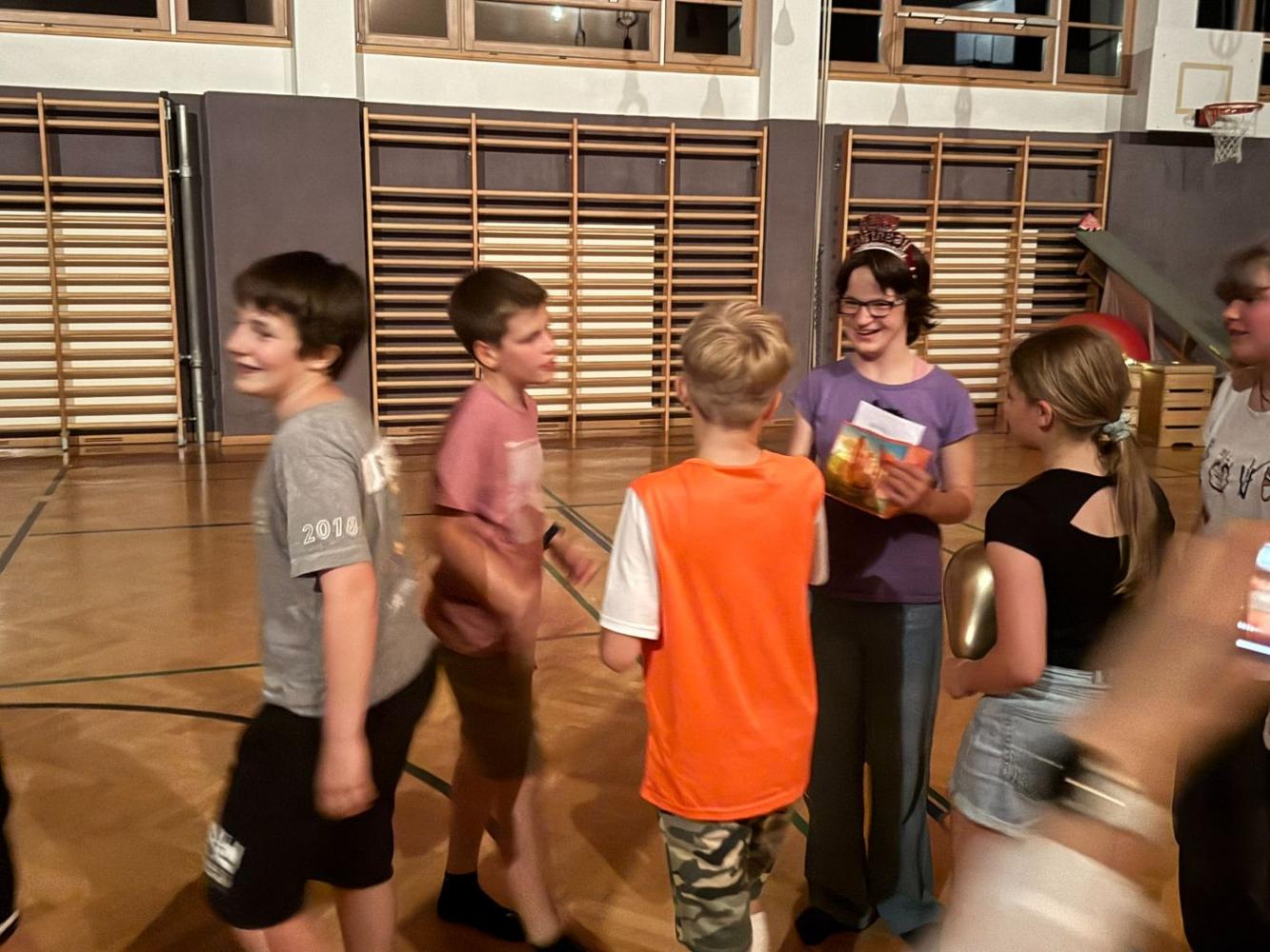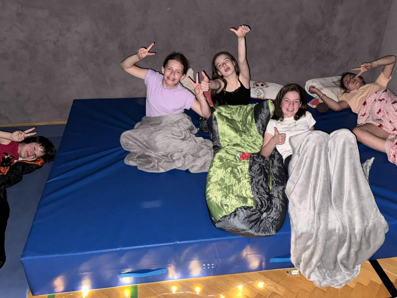 Als Erstes wurden die Schlafgelegenheiten im Turnsaal hergerichtet, bevor sich die Jungs und Mädels in der Schulküche versammelten, um sich für die nächsten Aufgaben mit Hot Dogs zu stärken. Damit die Schulveranstaltung den Titel „Lesenacht“ auch verdiente, mussten verschiedene Aufgaben bei einer Actionbound-Tour mit Stirnlampe gelöst werden. Dabei kam der Spaß natürlich nicht zu kurz, denn die Schülerinnen und Schüler sollten unter anderem unser Schulskelett im gruseligen Dachboden suchen, ein merkwürdiges, grünes Getränk kosten, eine Sequenz aus „Thriller“ nachtanzen und vieles mehr. Danach wurde im Turnsaal noch bei Discolicht und cooler Musik „abgedanced“. Um Mitternacht feierten wir dann in den Geburtstag unserer Franzi hinein. Die ganze Klasse gratulierte ihr pünktlich um 00:00 Uhr mit Kuchen und Geschenke. Bevor es dann ins Bett ging, spielten wir noch eine Runde Stirnlampen-Völkerball. Nach einer kurzen Schlafphase hieß es um 06:00 Uhr schon wieder Tagwache. Zügig wurden die Schlaflager wieder abgebaut und die Schülerinnen und Schüler genossen noch ein leckeres Frühstück von unserer Elternvertreterin Dominique - ein großes Dankeschön dafür! Etwas übermüdet, aber mit vielen lustigen Eindrücken ging es dann für alle in das wohlverdiente lange Wochenende.