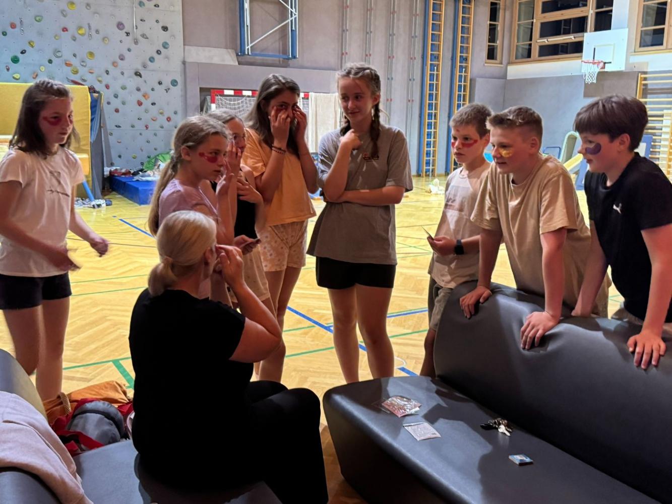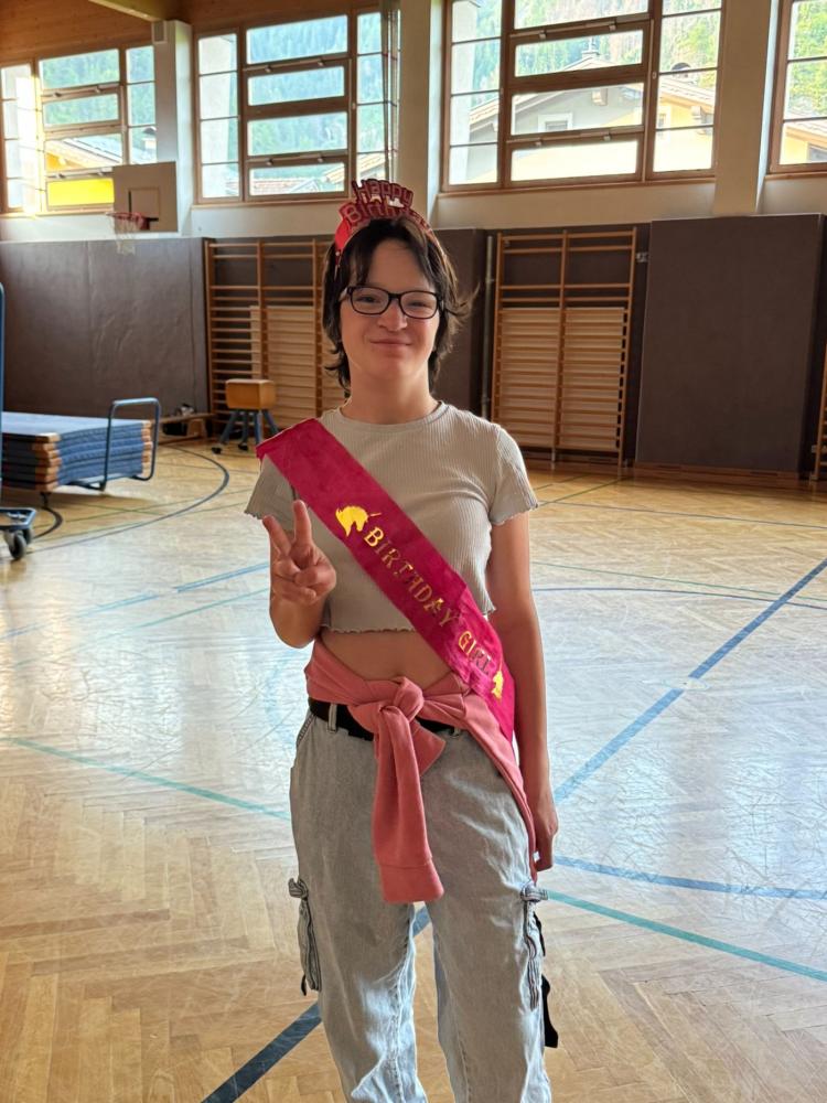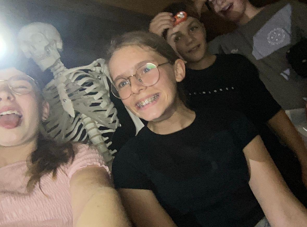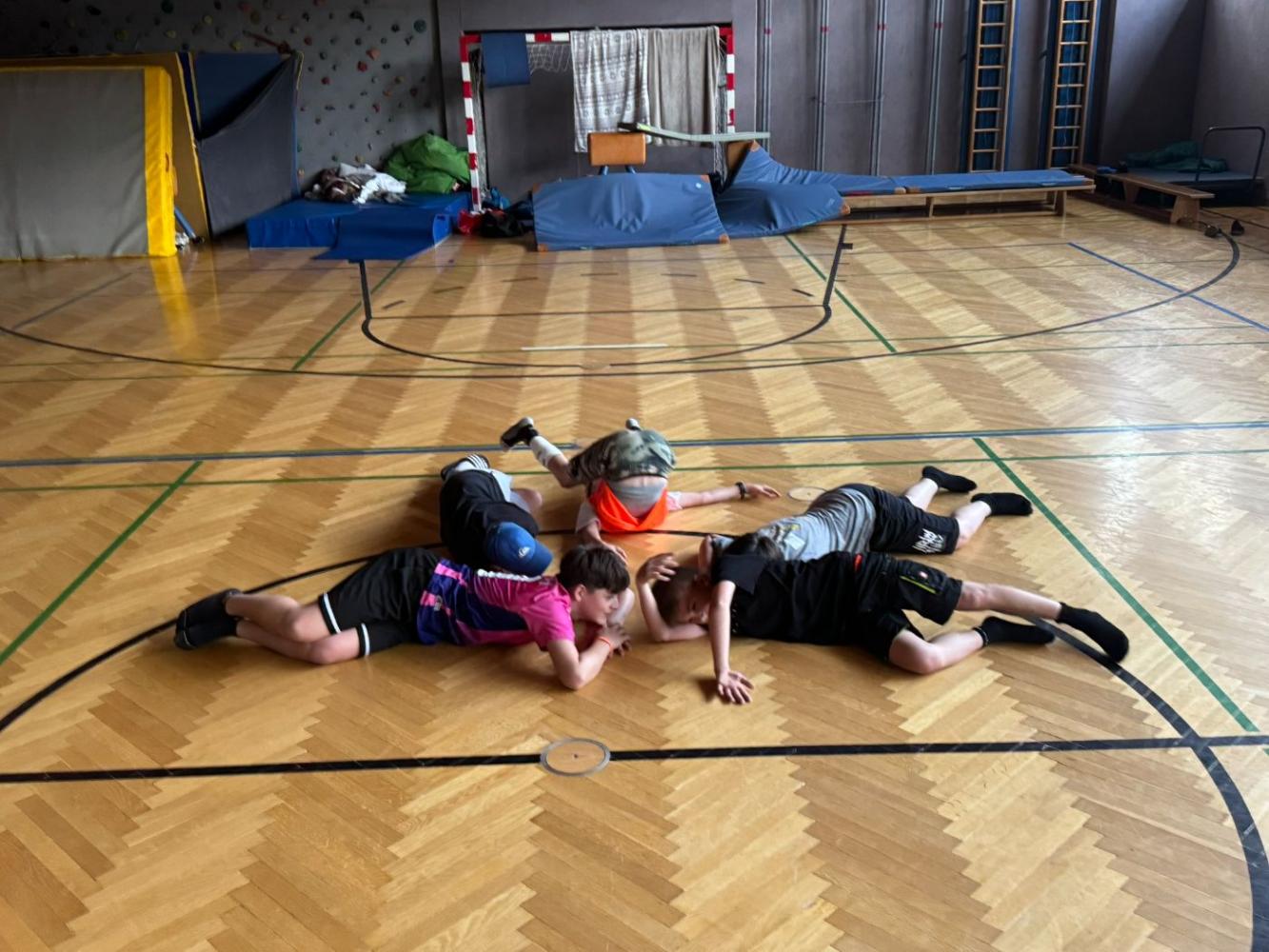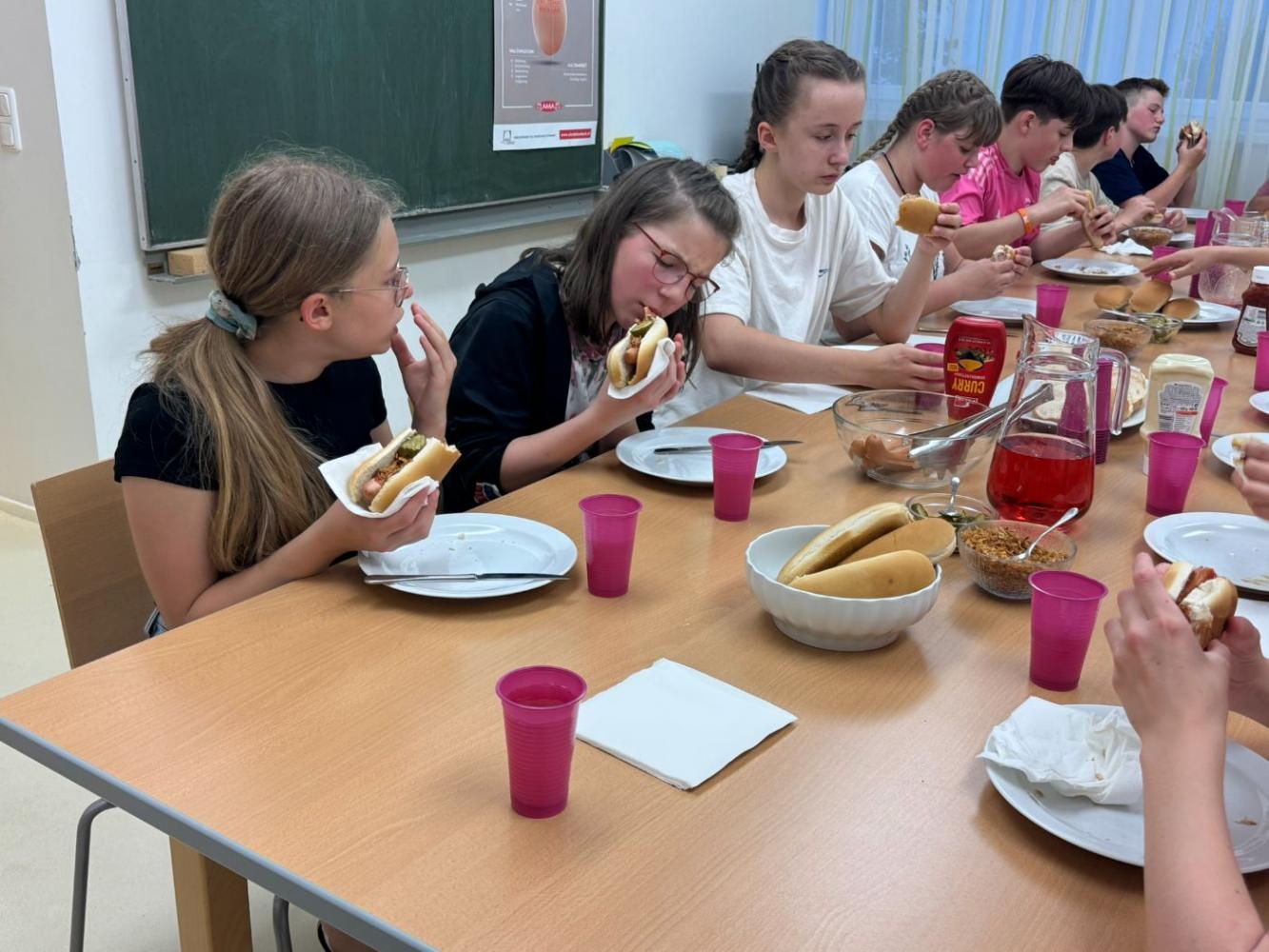 Als Erstes wurden die Schlafgelegenheiten im Turnsaal hergerichtet, bevor sich die Jungs und Mädels in der Schulküche versammelten, um sich für die nächsten Aufgaben mit Hot Dogs zu stärken. Damit die Schulveranstaltung den Titel „Lesenacht“ auch verdiente, mussten verschiedene Aufgaben bei einer Actionbound-Tour mit Stirnlampe gelöst werden. Dabei kam der Spaß natürlich nicht zu kurz, denn die Schülerinnen und Schüler sollten unter anderem unser Schulskelett im gruseligen Dachboden suchen, ein merkwürdiges, grünes Getränk kosten, eine Sequenz aus „Thriller“ nachtanzen und vieles mehr. Danach wurde im Turnsaal noch bei Discolicht und cooler Musik „abgedanced“. Um Mitternacht feierten wir dann in den Geburtstag unserer Franzi hinein. Die ganze Klasse gratulierte ihr pünktlich um 00:00 Uhr mit Kuchen und Geschenke. Bevor es dann ins Bett ging, spielten wir noch eine Runde Stirnlampen-Völkerball. Nach einer kurzen Schlafphase hieß es um 06:00 Uhr schon wieder Tagwache. Zügig wurden die Schlaflager wieder abgebaut und die Schülerinnen und Schüler genossen noch ein leckeres Frühstück von unserer Elternvertreterin Dominique - ein großes Dankeschön dafür! Etwas übermüdet, aber mit vielen lustigen Eindrücken ging es dann für alle in das wohlverdiente lange Wochenende.
