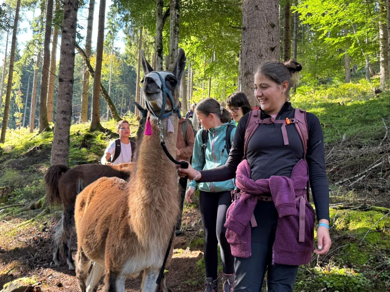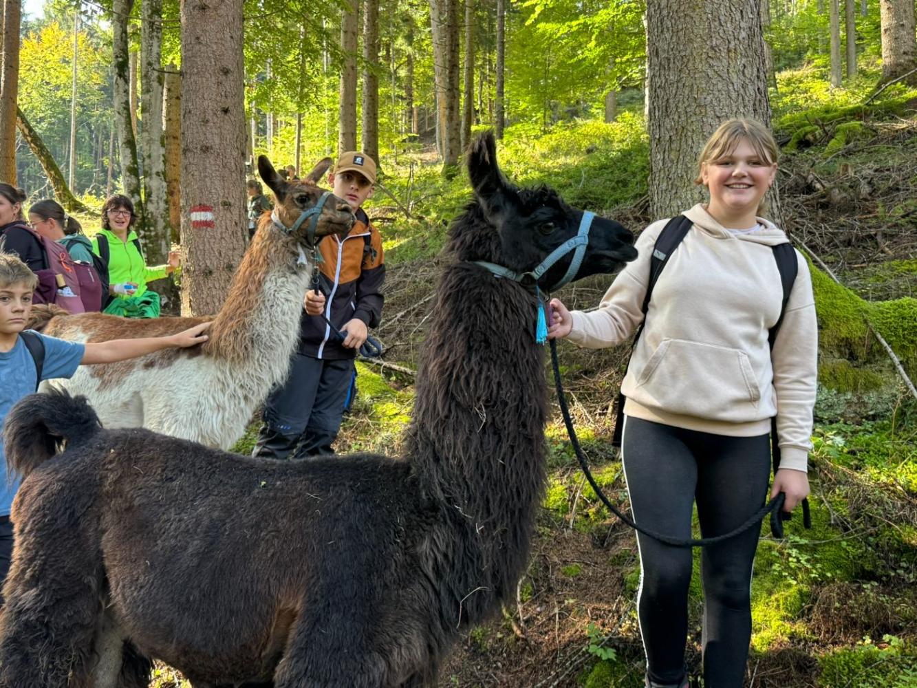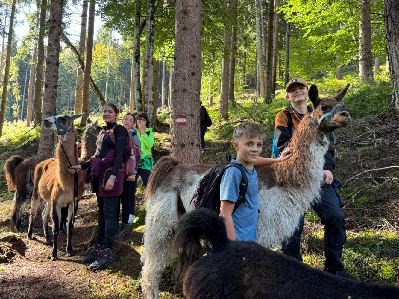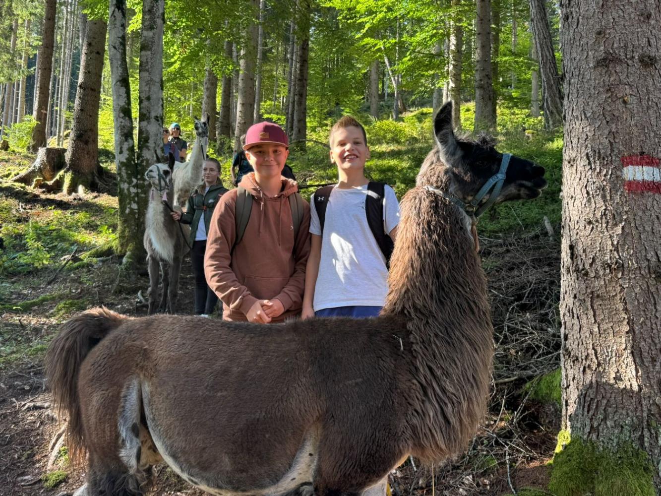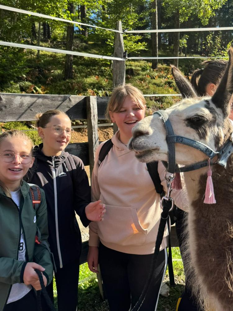 Die 3. Klassen starteten das heurige Schuljahr mit einem besonderen Ausflug, der sowohl die Teamarbeit innerhalb der Klassen als auch das Verantwortungsbewusstsein gegenüber Tieren stärken sollte. Mit dem Bus ging es nach Lienz, von wo die Schülerinnen und Schüler auf die Moosalm wanderten. Oben warteten schon zehn Lamas auf eine Wanderung. Nach einer kurzen Einschulung und einigen interessanten Informationen über die Tiere wurden die Lamas von den Schülerinnen und Schülern gehalftert und zu einem ausgiebigen Spaziergang ausgeführt. Sowohl die Kinder als auch die Lamas hatten dabei sichtlich Spaß und der anfängliche Respekt war bereits nach ein paar Metern verschwunden. Zum Abschluss machten die Schülerinnen und Schüler noch mit ihren Lamas ein kleines Wettrennen, bevor sie sich schweren Herzens wieder von ihnen verabschiedeten.
